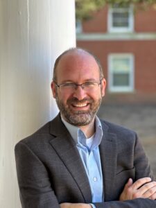 Person wearing a gray blazer and blue shirt.